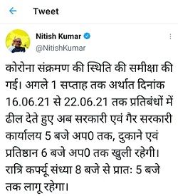 पटना। राज्य की सभी दुकानों के संचालन समय में एक घंटे की वृद्धि की गई है। दुकानें एक दिन के अंतराल पर अब शाम छह बजे तक खुली रहेंगी। पचास प्रतिशत क्षमता के साथ सरकारी एवं निजी कार्यालयों का समय अपराह्न पांच बजे तक होगा।