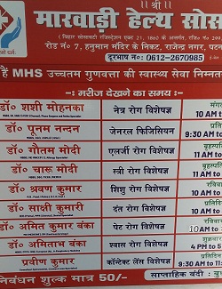 पटना। मारवाड़ी हेल्थ सोसायटी सेवा परमो धर्मः मंत्र को चरितार्थ कर रही है। राजधानी के राजेंद्र नगर, रोड नंबर सात स्थित मारवाड़ी हेल्थ सोसायटी भवन में सभी लोगों के लिए किफायती दर पर स्वास्थ्य सेवा उपलब्ध है। निबंधन शुल्क मात्र पचास रुपये है। जनरल फिजिसियन, आंख रोग, एलर्जी, स्त्री रोग, शिशु, दांत, पेट रोग, श्वास, शिशु ह्रदय रोग एवं कांटेक्ट लेंस विशेषज्ञों की टीम यहां उपलब्ध है।