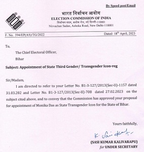 पटना। निर्वाचन आयोग ने बिहार की मोनिका दास को स्टेट ट्रांसजेंडर आइकन बनाया है। भारत निर्वाचन आयोग ने इस संबंध में आदेश जारी कर दिया है। बिहार के मुख्य निर्वाचन अधिकारी कार्यालय ने मोनिका दास को स्टेट ट्रांसजेंडर आइकन बनाने का प्रस्ताव भेजा था।