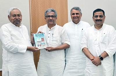 उद्योग मंत्री नीतीश मिश्रा ने अपनी किताब ‘Bihar Hai Taiyar- A journey of Transformation 2005-2025’ की पहली कॉपी मुख्यमंत्री नीतीश कुमार को भेंट की।